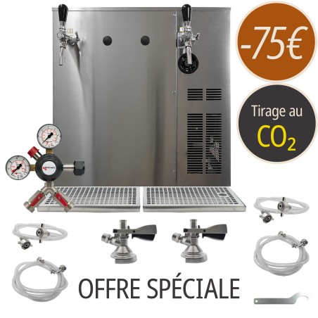 Matériel inclus : tireuse à bière à eau 60l/h 2 robinets, détendeur 2 sorties, tuyaux, clé robinet et 2 têtes de fût au choix.